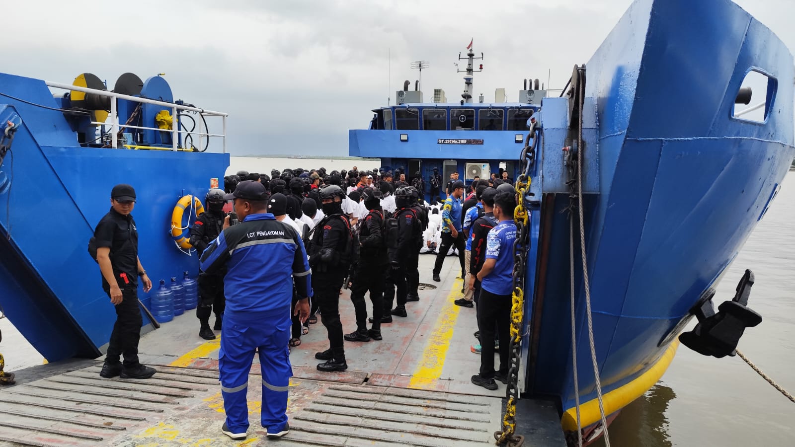 Petugas Lapas dan personel Brimob tengah mengawal proses pemindahan 100 narapidana kategori high risk narkoba dari Sumatera Utara ke Lapas Super Maximum Security Nusakambangan, Sabtu (14/6/2025).