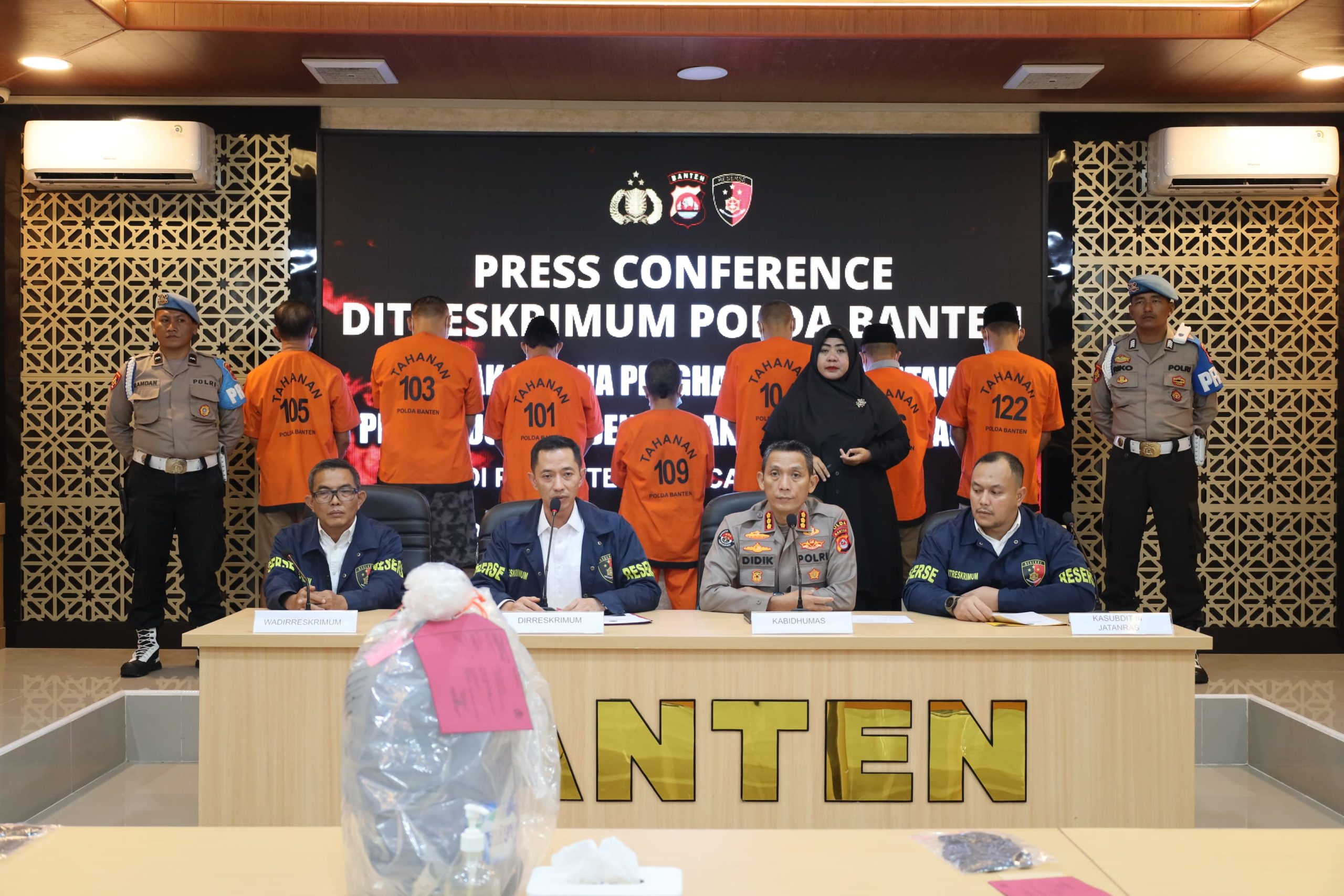 Dalam konferensi pers yang digelar Senin (30/06) di Aula Ditreskrimum Polda Banten, hadir Dirreskrimum Kombes Pol Dian Setyawan, Kabid Humas Kombes Pol Didik Hariyanto, serta Kasubdit III Jatanras Kompol M. Akbar Baskoro.