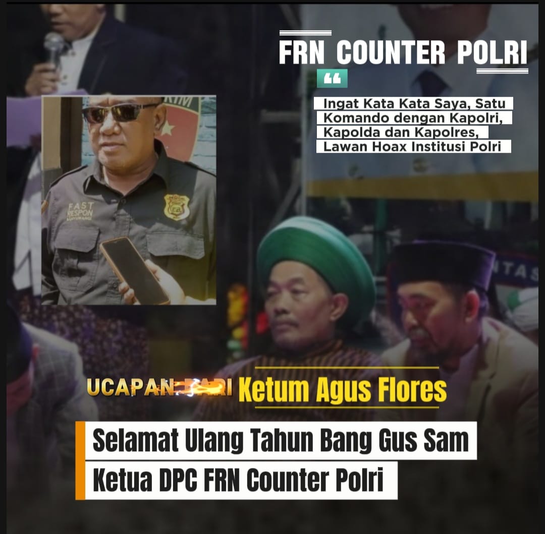 “Selamat ulang tahun Bang Gus Sam. Teruslah menjadi sosok pemimpin yang konsisten, loyal, dan berkomitmen dalam memperjuangkan misi FRN Counter Polri. Kita tetap satu komando dengan Kapolri, Kapolda, dan Kapolres dalam melawan hoaks dan menjaga marwah institusi Polri,” ujar Agus Flores dalam pernyataannya, dikutip MNRTV News, Minggu (13/7/2025).