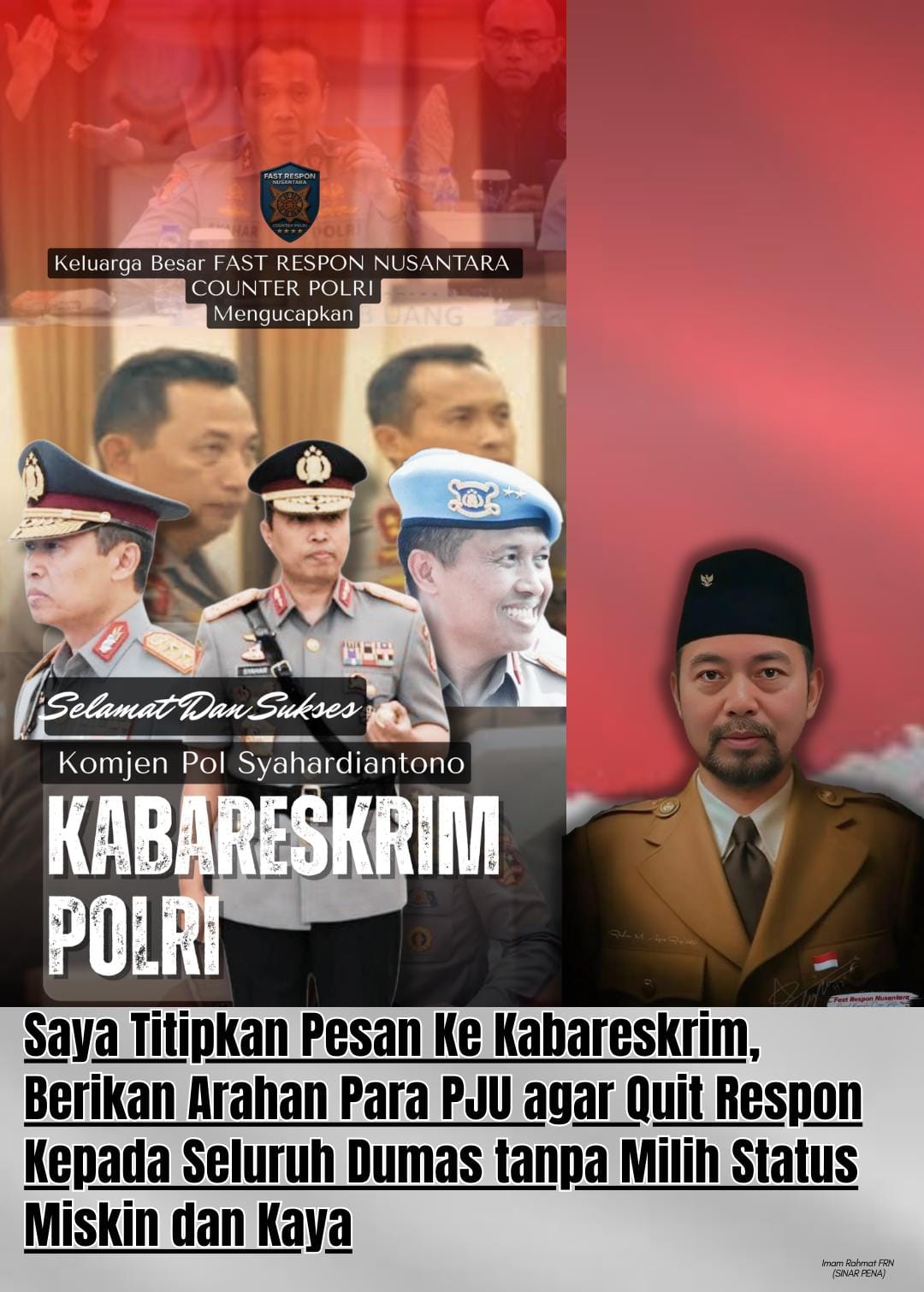MNRTV NEWS, Jakarta – Ketua Umum Perkumpulan Wartawan (PW) Fast Respon Nusantara (FRN) Counter Polri, Agus Flores, menyampaikan ucapan selamat dan sukses atas dilantiknya Komjen Pol Syahardiantono sebagai Kepala Badan Reserse Kriminal (Kabareskrim) Polri.
