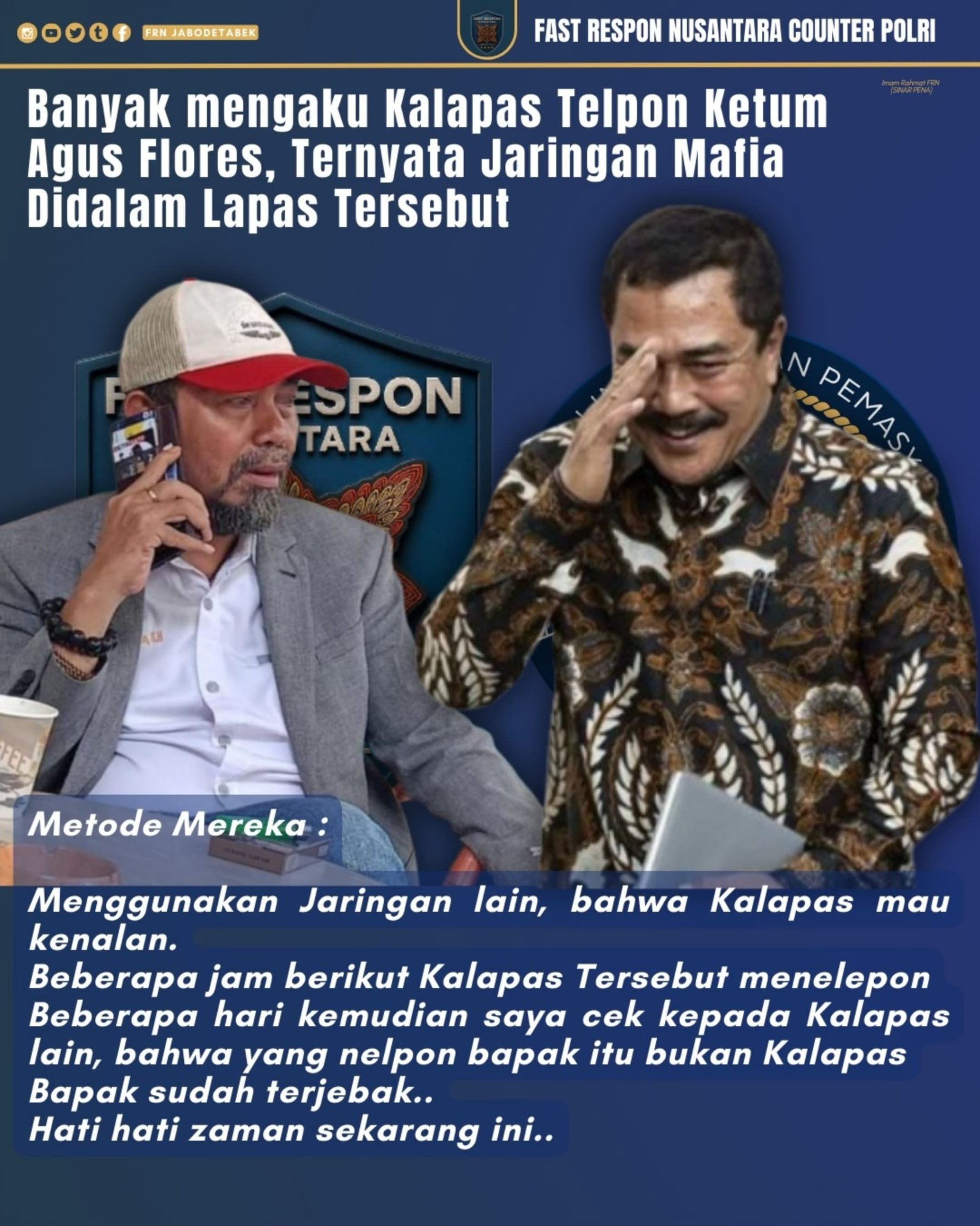 MNRTV NEWS, Jakarta – Ketua Umum Perkumpulan Wartawan (PW) Fast Respon Nusantara (FRN) Counter Polri, Agus Flores, hampir menjadi korban modus penipuan jaringan mafia lapas yang menyamar sebagai Kepala Lapas (Kalapas).