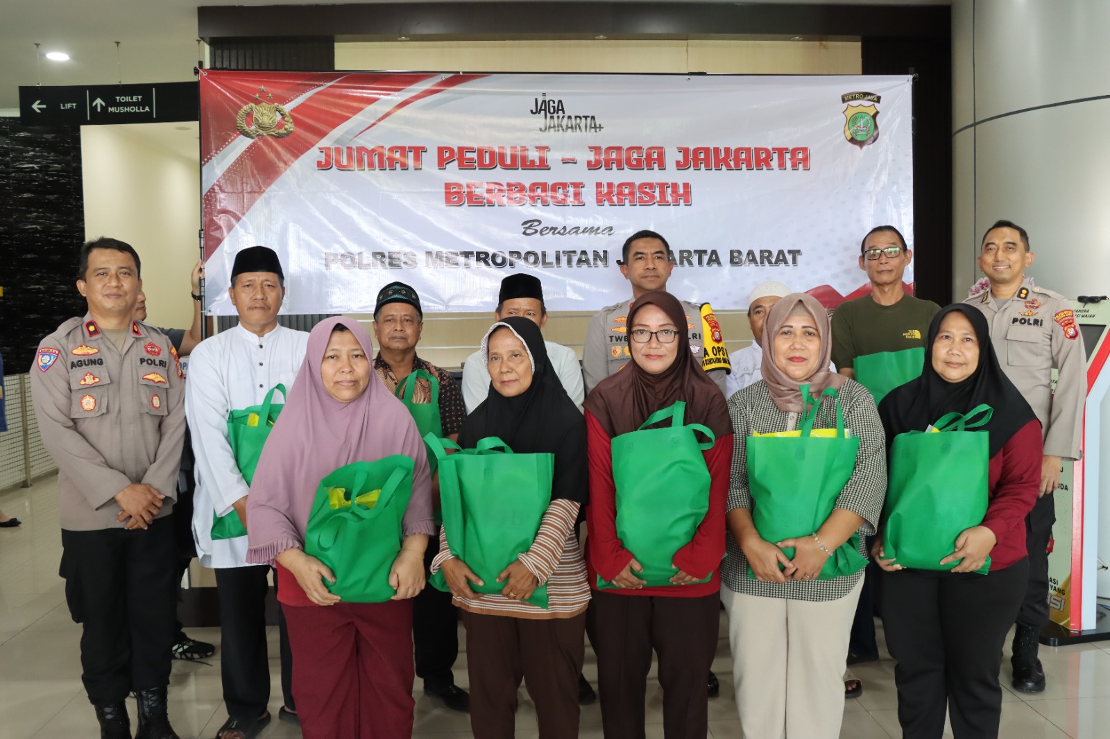 Melalui program Jumat Peduli – Jaga Jakarta Berbagi Kasih, sebanyak 30 warga menerima paket sembako berupa 100 kantong beras, masing-masing seberat 5 kilogram, yang diserahkan langsung oleh Kapolres Metro Jakarta Barat, Kombes Pol Twedi Aditya Bennyahdi.
