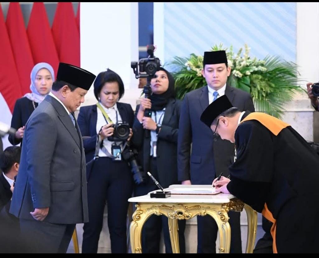 MNRTV NEWS, JAKARTA – Presiden Prabowo Subianto menyaksikan pengucapan sumpah Dwiarso Budi Santiarto sebagai Wakil Ketua Mahkamah Agung (MA) Bidang Non Yudisial di Istana Negara, Jakarta, Senin (10/11/2025).