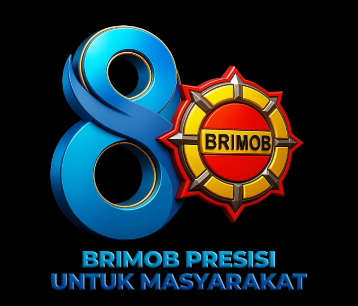 Logo HUT ke-80 Brimob tahun 2025 menampilkan angka 80 dengan elemen roda sebagai simbol pergerakan dan kesiapsiagaan tanpa henti. Warna merah, kuning, hitam, dan emas melambangkan keberanian, kejayaan, ketegasan, dan kehormatan yang menjadi identitas Brimob sejak masa perjuangan hingga kini.