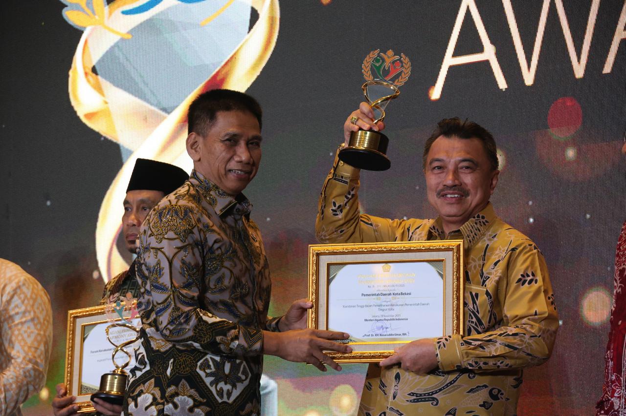 Dalam kesempatan itu, Wakil Wali Kota Bekasi Abdul Harris Bobihoe menerima langsung piagam penghargaan yang diserahkan oleh Wamendagri RI.
