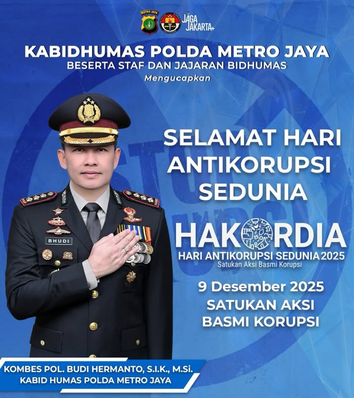MNRTV News, Jakarta – Kepolisian Daerah Metro Jaya beserta staf dan seluruh jajaran menyampaikan ucapan memperingati Hari Anti Korupsi Sedunia (HAKORDIA) 2025 yang jatuh pada 9 Desember 2025. Melalui unggahan resmi akun @poldametrojaya, Polda Metro Jaya mengajak seluruh masyarakat untuk memperkuat komitmen antikorupsi dengan mengusung pesan utama “Satukan Aksi Basmi Korupsi.”
