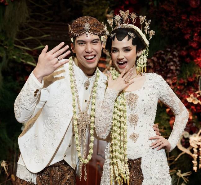Kedua mempelai tampil selaras dalam busana bernuansa putih. El Rumi mengenakan pakaian adat Jawa lengkap dengan blangkon, memancarkan wibawa khas pengantin pria. Sementara itu, Syifa Hadju tampil memukau dalam kebaya klasik panjang berwarna putih dengan detail halus, dipadukan riasan paes dan sanggul tradisional yang memperkuat kesan elegan sekaligus bersahaja.